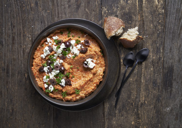 Krydret dip af bagte auberginer og peberfrugter drysset med ost og oliven. I denne opskrift får du smagen af orienten og sydlige himmelstrøg. De grillede peberfrugter giver dippen dybde og karakter. Ajvar-dippen som stammer fra Balkan, er for længst nået til Danmark og passer rigtig godt til vores moderne køkken. Server dippen til salat eller brød. Som dyppelse til friske grøntsagsstave, som snacks eller til dit kød.