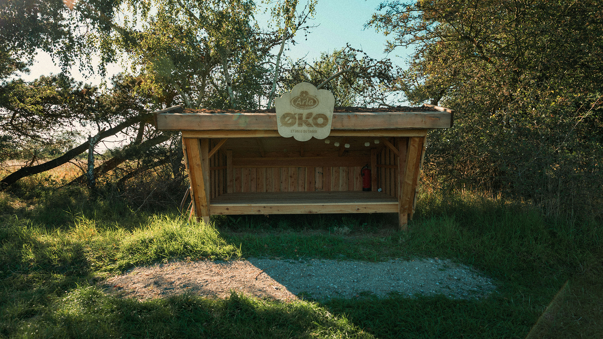 Tæt på Arla® ØKO shelteret er der p-plads, og herfra fører marken til shelteret. Fra p-pladsen er der cirka 30 meter gennem et lettere kuperet landskab.